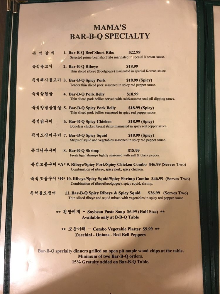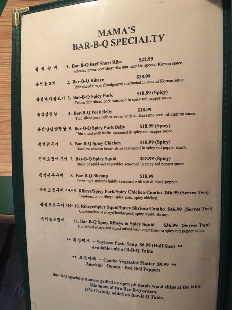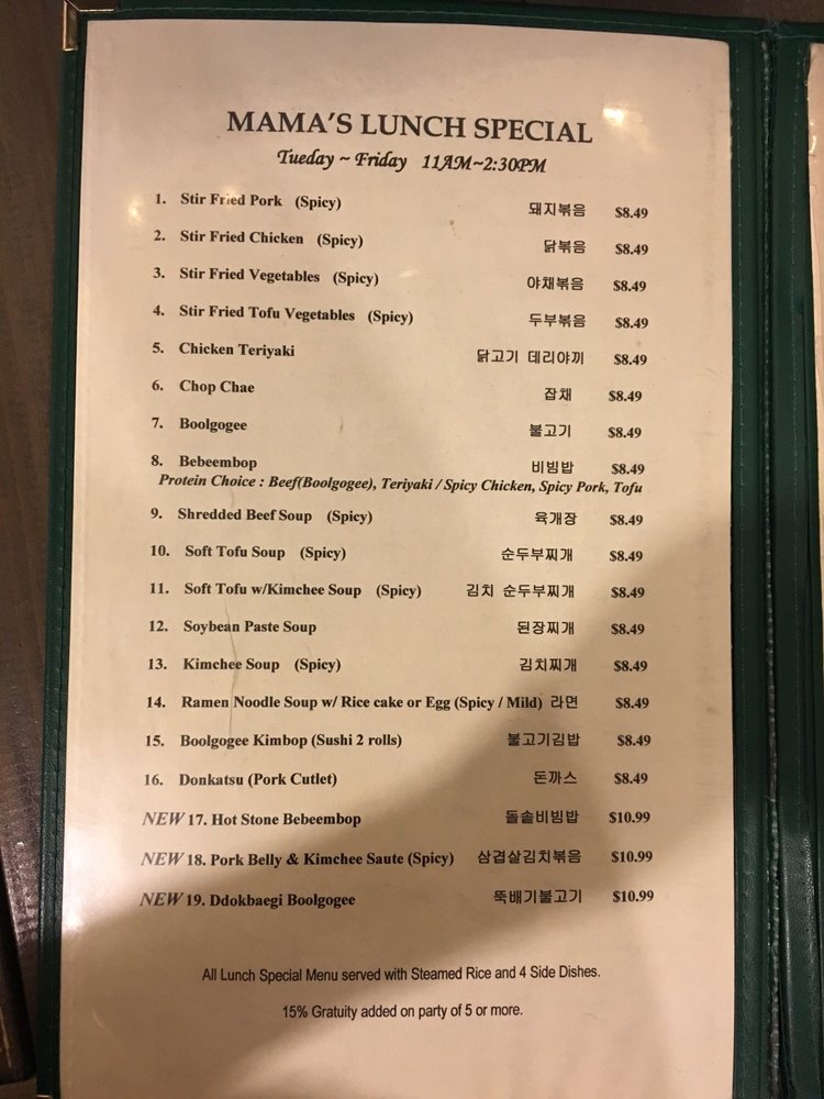 Mama's Restaurant offers a wide range of Korean dishes in a casual yet classy setting. Located in Bloomington, IN, Mama's provides options for vegetarians and groups, with delivery and takeout available. The menu features appetizers like Seafood and Kimchi Pancakes, as well as Dinner options such as Short Ribs and Grilled Pork Belly. Customers rave about the authentic flavors and generous portions, with highlights including the Bulgogi Fried Rice and Cold Bebeembop. While prices may be on the higher side, the fresh ingredients and attentive staff make it a worthwhile dining experience. Whether you're a Korean food enthusiast or just looking to try something new, Mama's Restaurant comes highly recommended for its delicious and satisfying meals.